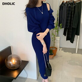 肩だしニットの重ね着がおしゃれなハイネックの長袖セットアップワンピース 2色
